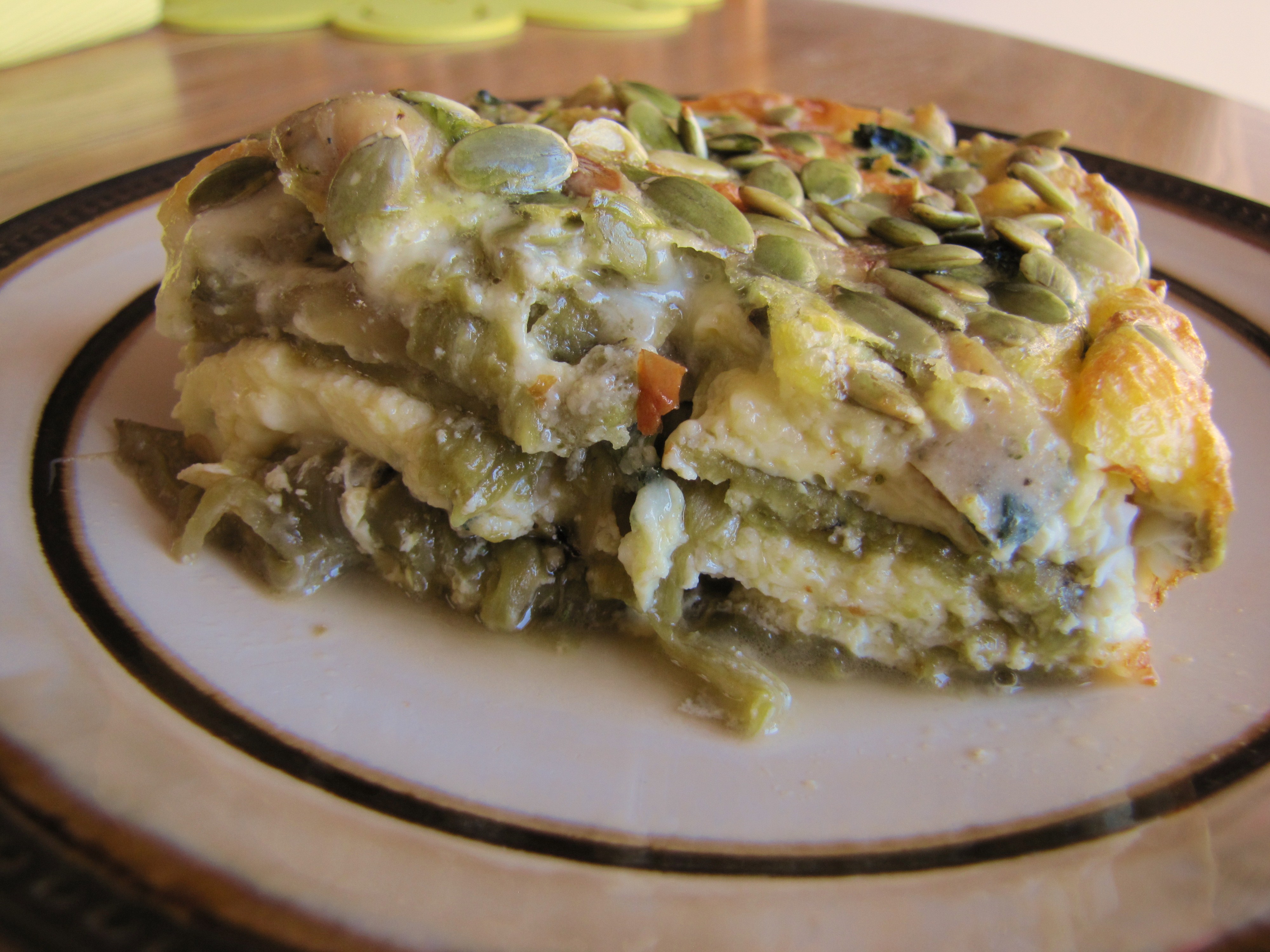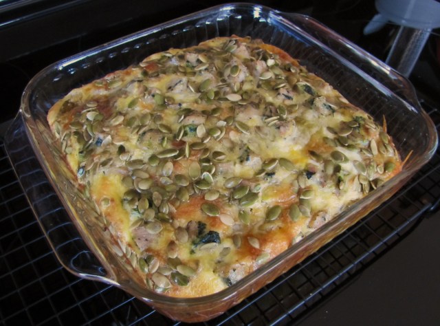 Enter the Roasted Green Chile Breakfast Casserole…layers of green chilies rather than corn tortillas, a creamy egg mixture in place of the soup and sauce and lots of cheesy goodness pull it all together along with raw pumpkin seeds toasted on top for a bit of added crunch. I usually add some sort of meat (whatever I have leftover in the fridge that needs to be used up) but the original recipe is meat-less. Included in this post is the “original” recipe for the casserole that I got from my mom and also mine with a few alterations. You will find that this recipe can be adapted very easily to your families liking, dietary needs and size.