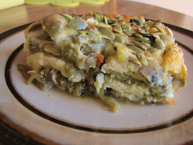 Back in my gluten, grain and “not so healthy” conventional grocery store days I regularly made a Green Chile Chicken Enchilada Casserole for my family…loaded with white tortillas, canned soup (!!!), canned green chile enchilada sauce (was there even green chilies in there?) and lots of bright yellow cheese. It doesn’t sound too appetizing when the ingredients are listed out that way but it was very, very tasty and one of our favorite weeknight meals! Thankfully, I was able to duplicate the recipe using nutritious, healthy, organic and gluten-free ingredients so my family could still enjoy it. However, since I have been grain-free for the last year or so this dish has been off the menu for me…until now.