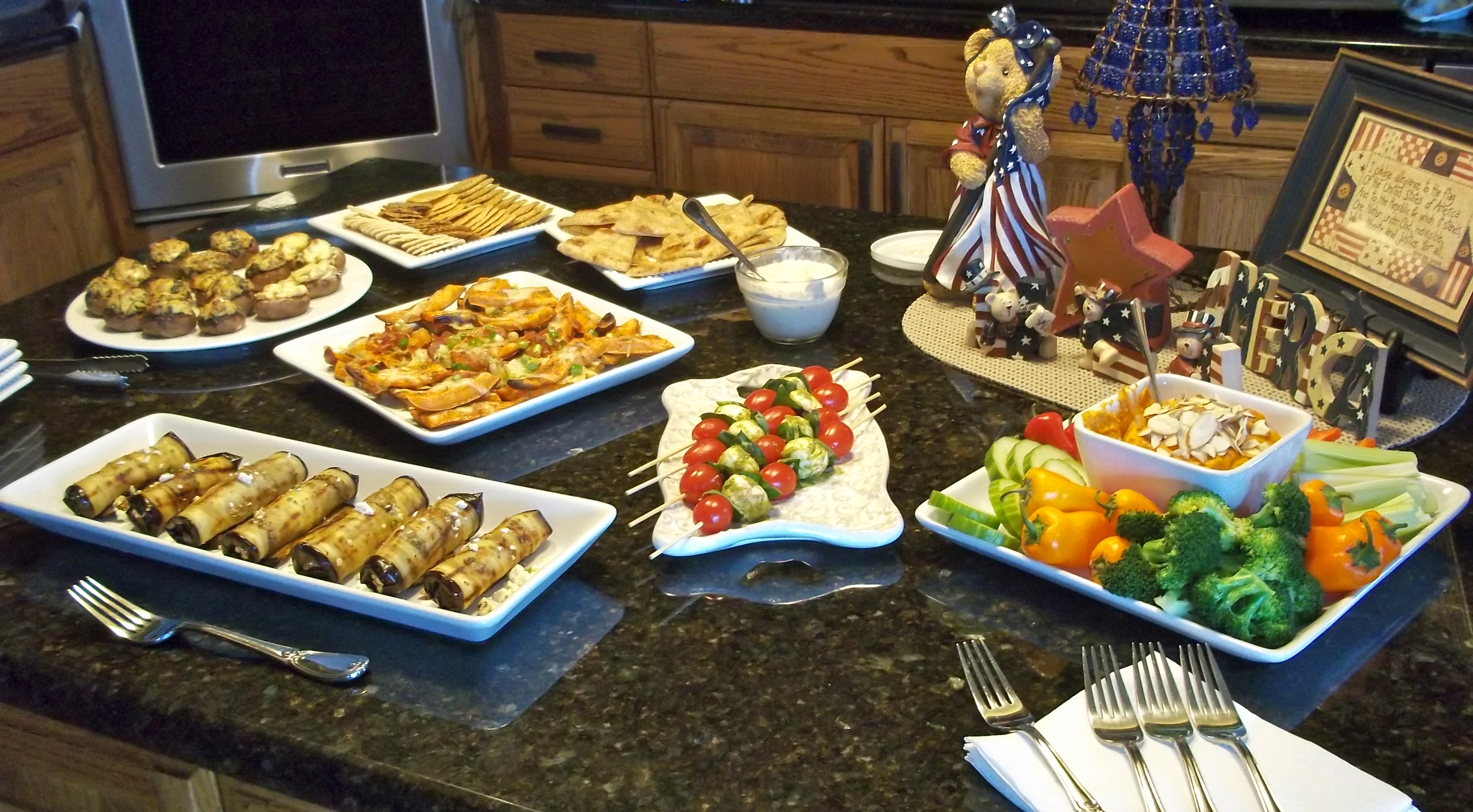 For that event I did sausage and spinach stuffed mushrooms, roasted red pepper hummus with veggies, grilled eggplant roll ups stuffed with feta cheese and olive tapenade, oh and spicy sweet potato skins. Everything was fabulous!