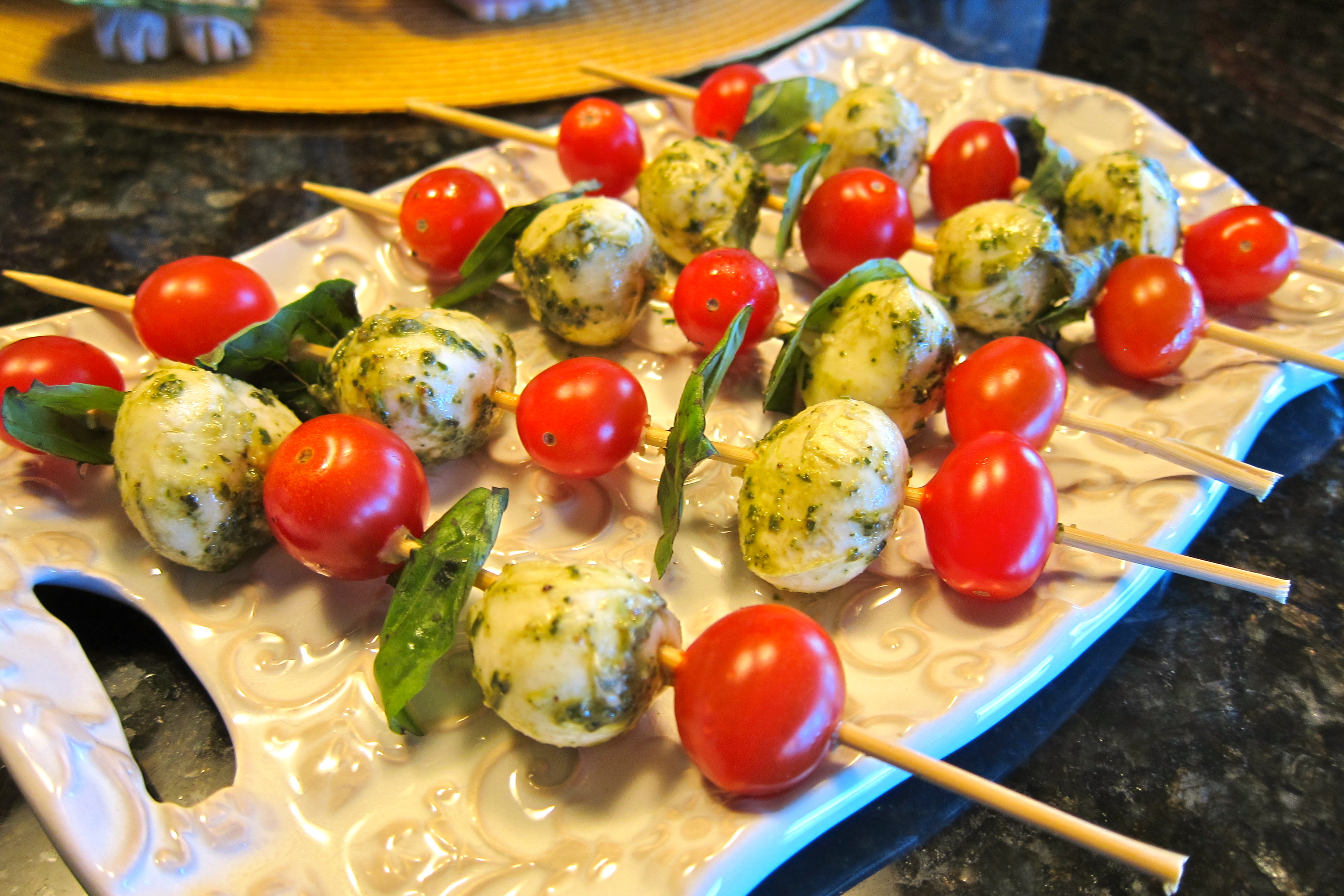 Assemble the skewers by alternating the ingredients…start with a tomato, next a pesto marinated mozzarella ball, then a fresh basil leaf. Repeat, ending with a cherry tomato. Trim the ends of the skewers if necessary to fit on your serving dish.