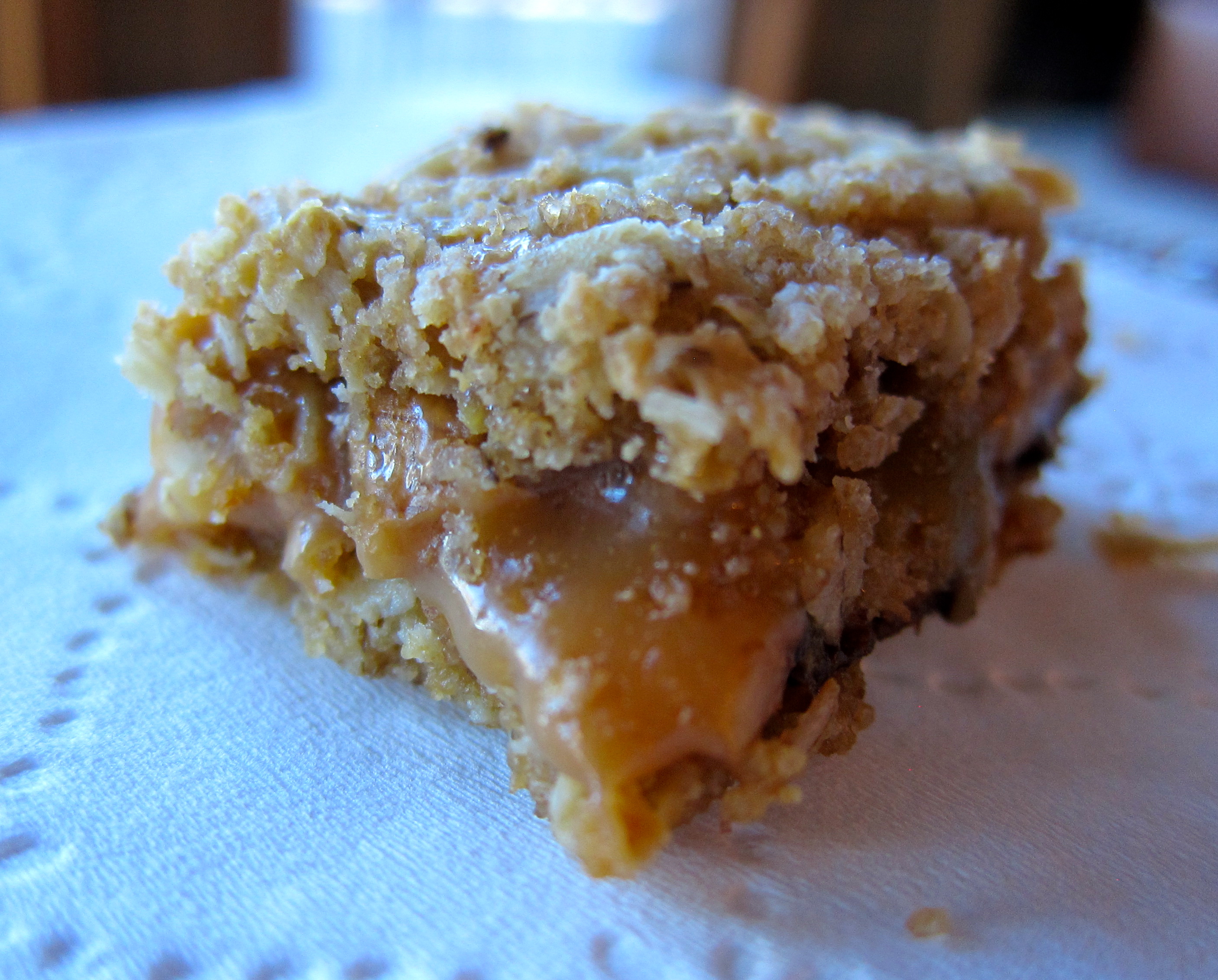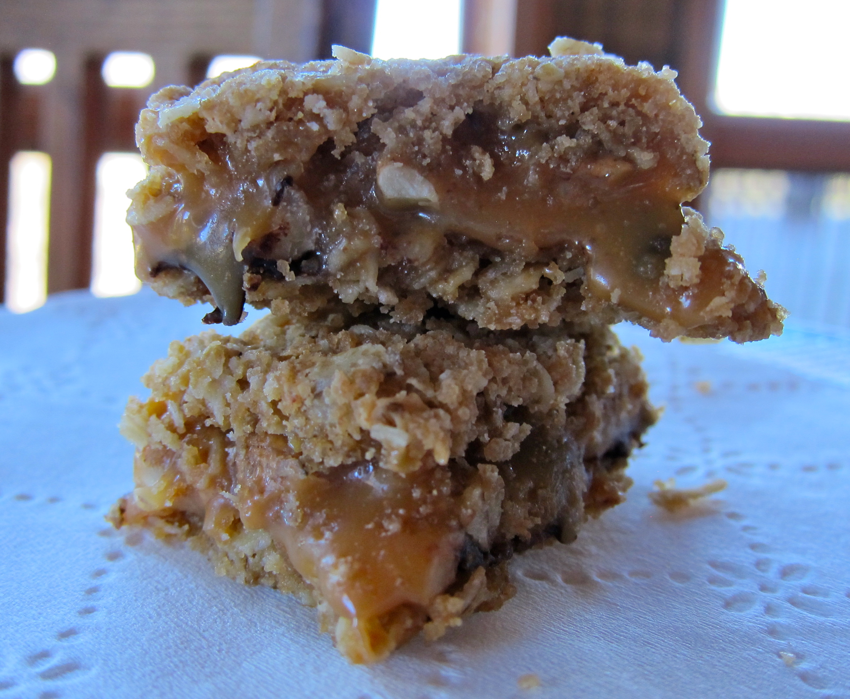 Bake the cookie crust for about 8 minutes. Remove and while still warm sprinkle the crust with chocolate chips and pecans. Pour the melted caramel over the chocolate and pecans and spread evenly, not all the way to the sides if possible (usually not though!). Sprinkle the remaining oat mixture over the top of the caramel and press lightly into the warm caramel.